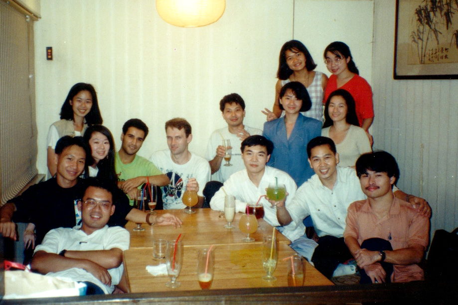 為學習中華文化,胡焱榮於1994年進入臺灣師範大學學習中文。於師大學習期間,與同學聚餐(右前2舉杯者)。